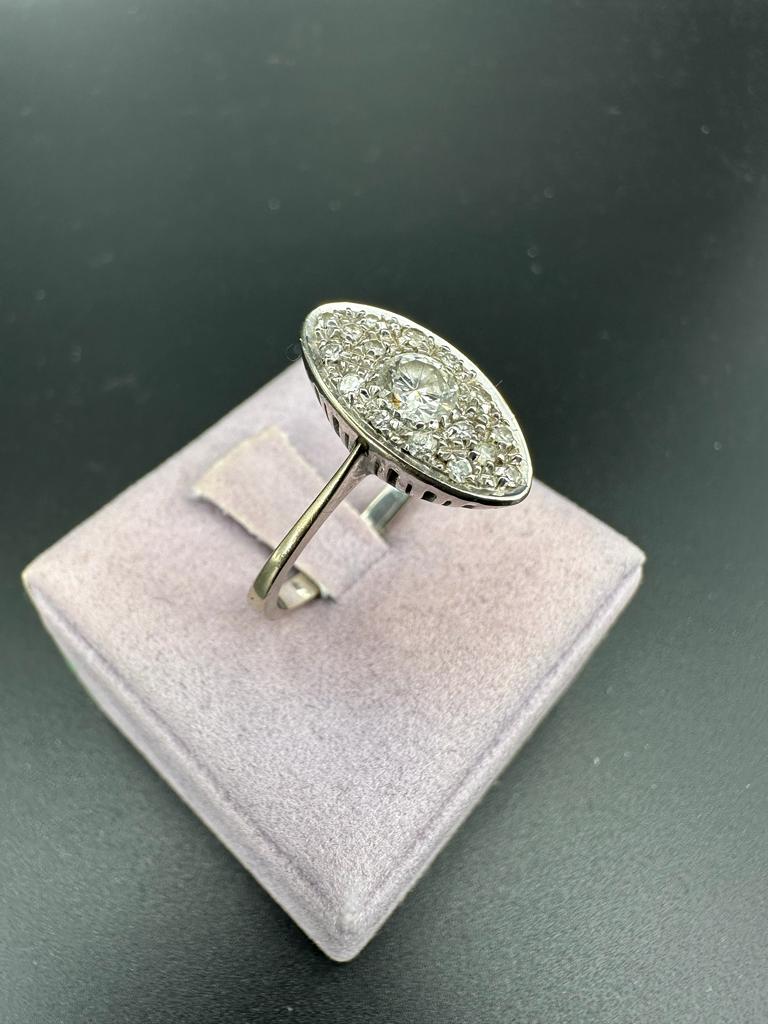 Anello vintage in oro bianco 18 carati, al centro 1 diamante taglio brillante emerge nella sua luminosità. Il gioiello è corredato da un contorno di altri diamanti che creano un gioco di luci. Descrivendo stile ed eleganza di altri tempi