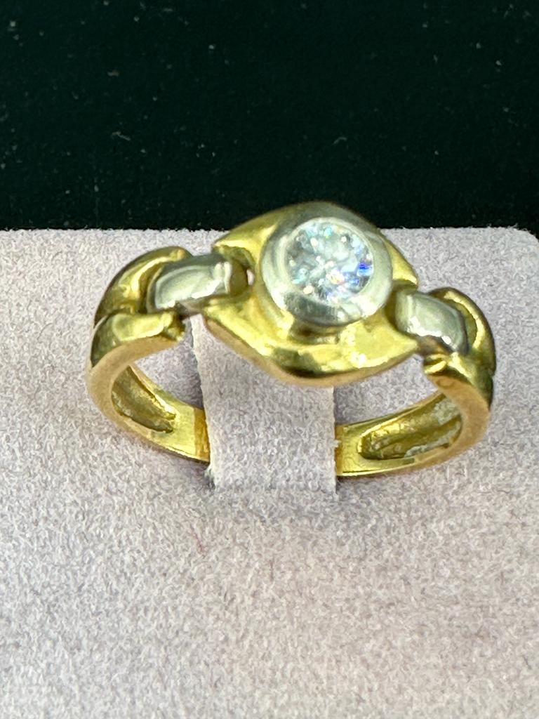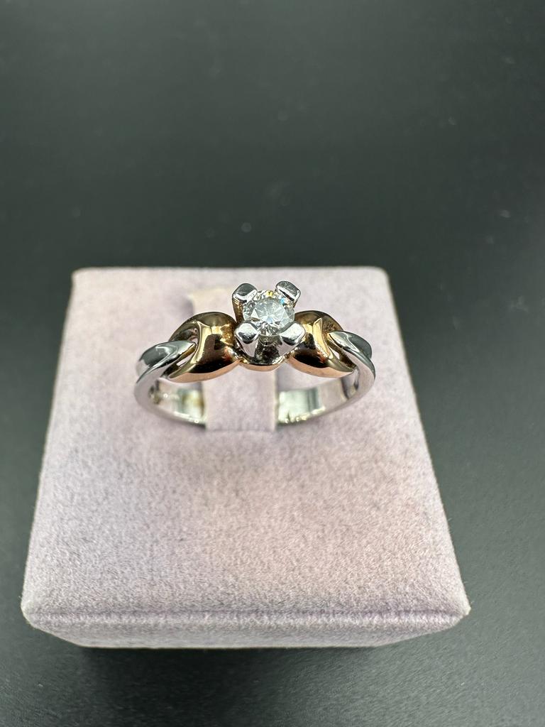 Anello “Solitario” in oro bianco e giallo 18 carati impreziosito al centro con un raffinato diamante taglio brillante