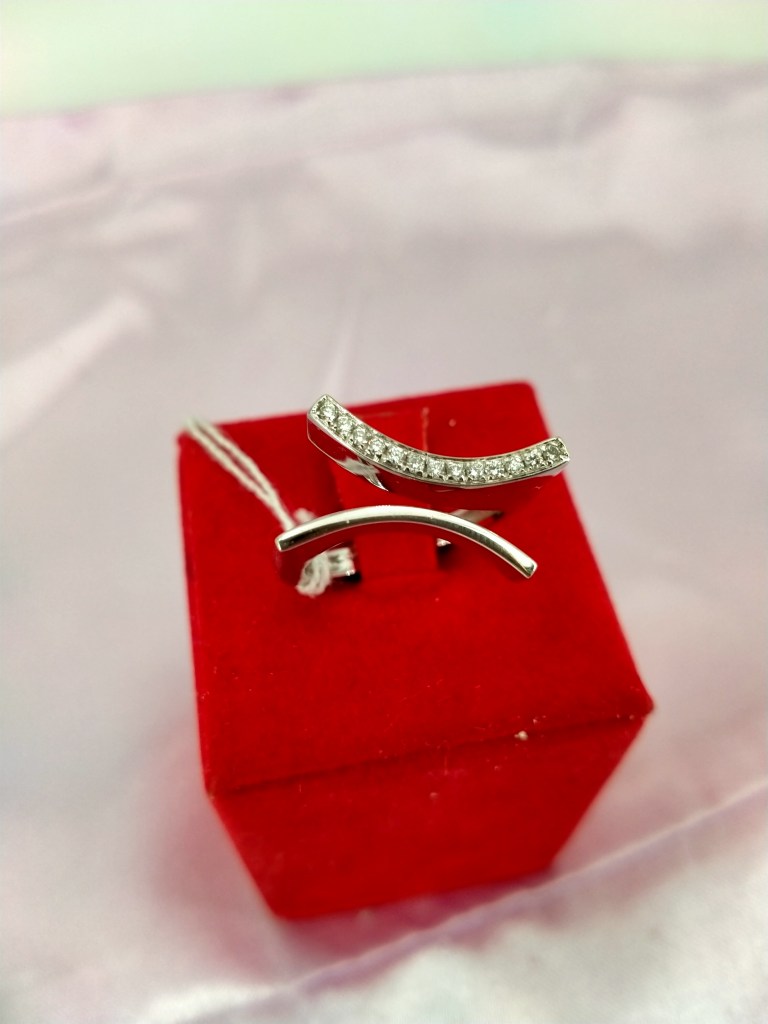 Anello in oro bianco e giallo 18 carati con diamanti taglio brillante incastonati sulla rivier in oro bianco che delineano un onda, un flusso di luce ed eleganza, che esprime la bellezza del gioiello